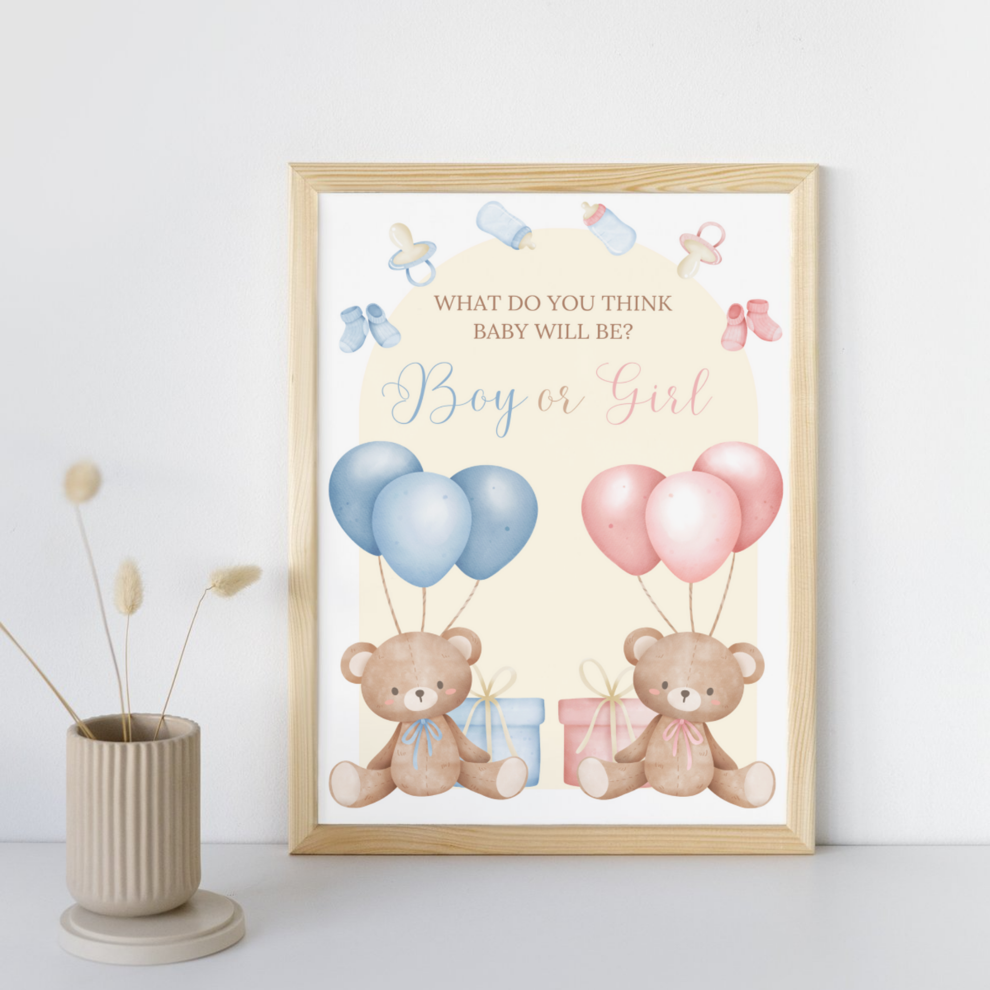 Boy or girl⌠we canât wait to reveal! Our blue and pink gender reveal baby shower invitation is the perfect way to invite family and friends to this exciting celebration. With its playful color palette and modern design, it sets the stage for a joyful day filled with love, laughter, and the big reveal.