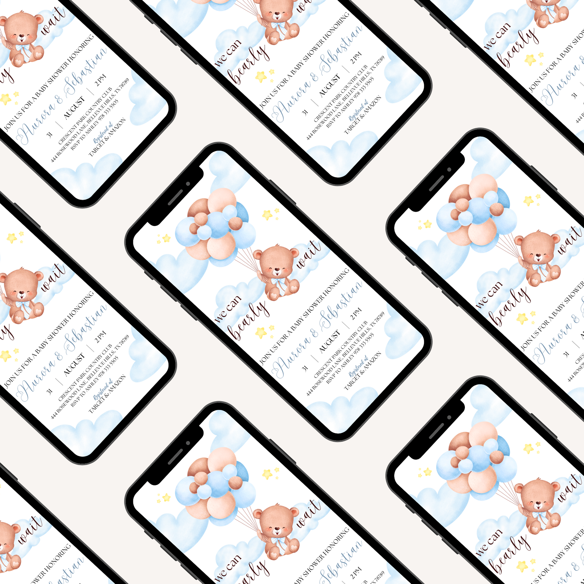 We Can Bear-ly Wait Baby | Baby Shower Invitation | Bear in the Clouds Theme | Blue